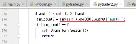 그래서 어디가 문제인가 하는 생각이 들었더니, 일단 위 스크린샷에 보이는 것처럼, 계좌정보를 가지고 와서 multi의 데이터 길이가 0이면 그냥 다시 시작하라는 메서드로 가도록 예전에 코드를 짰는데, 이 부분이 문제가 된 것을 볼 수 있었습니다.