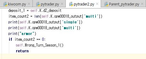 그래서 어디가 문제인가 하는 생각이 들었더니, 일단 위 스크린샷에 보이는 것처럼, 계좌정보를 가지고 와서 multi의 데이터 길이가 0이면 그냥 다시 시작하라는 메서드로 가도록 예전에 코드를 짰는데, 이 부분이 문제가 된 것을 볼 수 있었습니다.