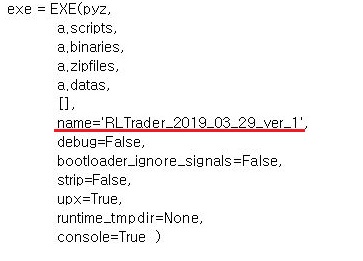 그리고 나서 main.spec파일로 가서, 위 스크린샷에 보이는 것처럼 한번 만들어 질 exe파일의 이름을 바꾸어 보도록 합니다.