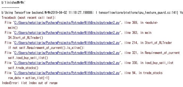 그러나 기대한 대로 되기는 커녕, 이번에도 무언가 제대로 나오지 않는 것을 확인할 수 있을 뿐이었습니다. 왜 인지는 모르지만, 계속해서 pytrader2상에서 에러를 내는 것 입니다.