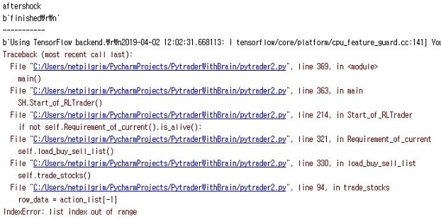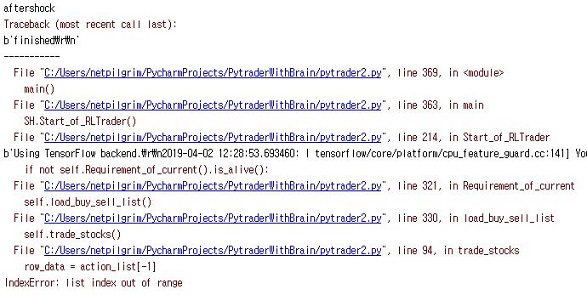 그러나 기대한 대로 되기는 커녕, 이번에도 무언가 제대로 나오지 않는 것을 확인할 수 있을 뿐이었습니다. 왜 인지는 모르지만, 계속해서 pytrader2상에서 에러를 내는 것 입니다.