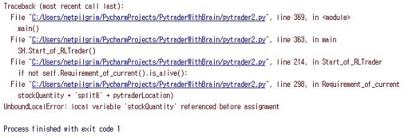 일단 위 스크린샷처럼 잘 가다가 pytrader2가 어떤 에러를 일으키는 것을 확인할 수 있기는 있었습니다. 그래서 이 에러가 어디가 문제인지 알아봐야 합니다.