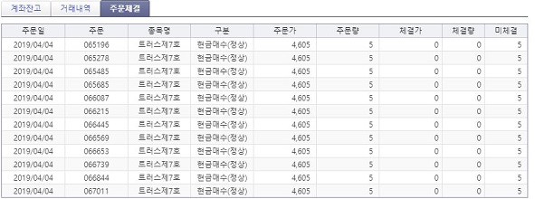 일단 키움증권 홈페이지로 가서, 진짜로 거래가 일어난 것인지 살펴보았는데, 진짜로 매수주문을 냈는 것을 확인할 수 있기는 있었습니다. 그런데 문제는 주문을 냈다고 다 매수가 되는 것도 아니고, 미체결이 된다는 것 입니다.
