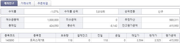 일단 상당히 미완성된 주식 인공지능 이기는 하지만, 그래도 pytrader2가 제대로 작동을 하기는 하기 때문에, 목요일 주식 모의투자에 제 프로그램을 적용시켜 보고자 했습니다. 그리고 나서 그 결과를 이번 포스팅에서 올려 보고자 합니다. 이 모의투자는 우선 트러스제7호-종목코드 140890을 가지고서 했었고, 선택한 기준이 상당히 모호한 것을 사용했기 때문에, 수익을 기대하고 하는 것 까지는 아닙니다.