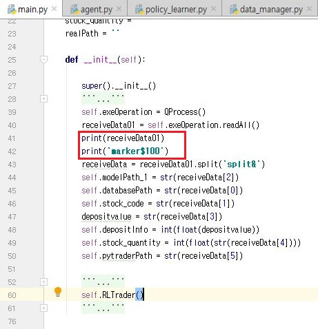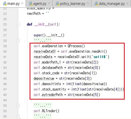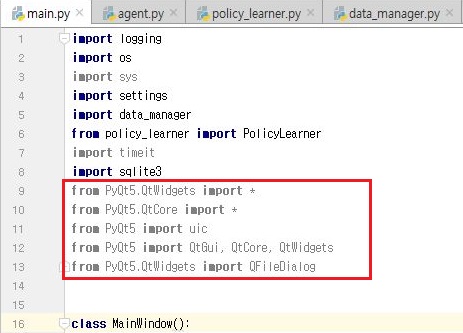 다음으로는 RLTrader의 역할을 하는 스크립트에서는 위 스크린샷과 같이 pyqt5에 대한 다양한 사항을 import해 주도록 만들어 주도록 합니다.