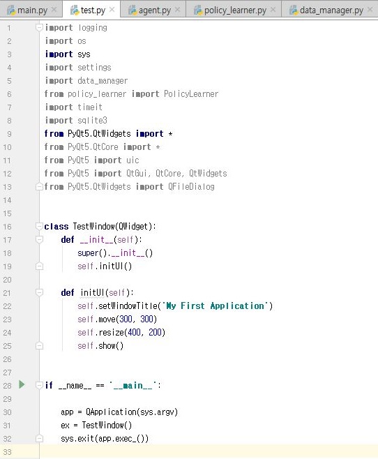 이제 pytrader3로 돌아와서, 여기서는 위 스크린샷처럼 main.py가 아니라 test.py를 실행시키기 위해서 한번 코드를 변형해서 제대로 실행이나 되는지 부터 확인해 보도록 합니다.