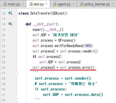 일단 그냥 5라는 값이 다른 의미도 있지만, 원래는 디폴트 값이라는 의미도 있기 때문에 특별한 에러가 없다는 의미도 역시 됩니다. 그래서 이번에는 자식 프로세스가 되는 test.py에서 위 스크린샷과 같이 QProcess에서 어떤 에러가 나왔는지를 살펴 보고자 합니다.