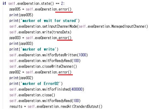 일단 그냥 5라는 값이 다른 의미도 있지만, 원래는 디폴트 값이라는 의미도 있기 때문에 특별한 에러가 없다는 의미도 역시 됩니다. 그래서 이번에는 자식 프로세스가 되는 test.py에서 위 스크린샷과 같이 QProcess에서 어떤 에러가 나왔는지를 살펴 보고자 합니다.