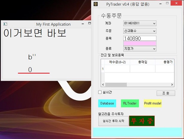 다음으로는 부모 프로세스인 pytrader4.py에서는 입력이 될 데이터를 아예 입력하지 않도록 해 봅니다. 그리고 나서 자식 프로세스가 실행이 되면, 0이 결과로 나올 것 입니다.
