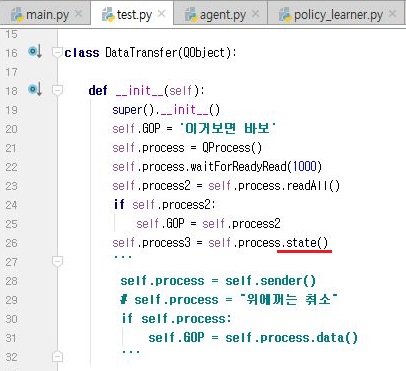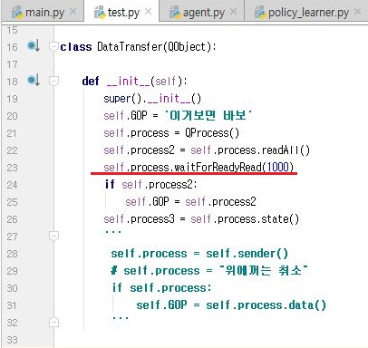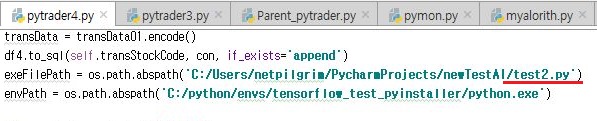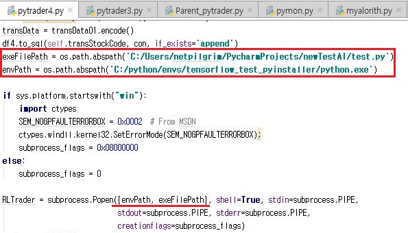 그리고 나서 위 스크린샷에서 보이는 것처럼 부모 프로세스가 되는 pytrader4.py로 가서 기존에 test.py로 되어 있던 것을 test2.py로 바꾸어 주도록 합니다.