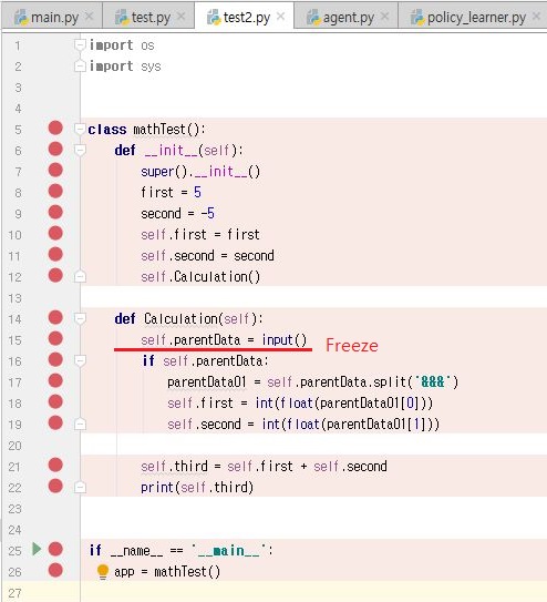 그런데 어떻게 된 것인지 input()이 들어간 부분에서 계속해서 프로그램이 그냥 얼어버리는 것을 확인할 수 있었습니다. 이 얼어버리는 원인이 무엇인지 알아봐야 하는 생각이 들었습니다.