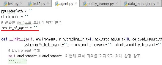 그래서 먼저 agent.py에 가서, 위 스크린샷에서 보이는 것처럼 def __init__(self): 라는 초기화라고 해야 할까요? 처음 스크립트가 시작되지 마자 실행되는 파일에서 먼저 self.가 붙은 광역 변수가 실행되도록 만들어 줍니다.