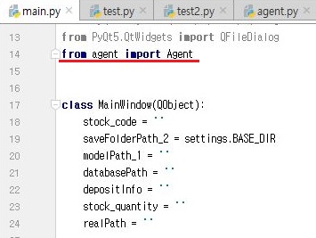 그리고 나서 main.py로 가서 위 스크린샷처럼 이제 agent 모듈의 Agent 클래스를 임포트 하도록 해 줍니다. 이런 식으로 일단 어떻게 가지고 오도록 만들어 봅니다.