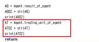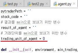 그리고 나서 main.py에 가서, 위 스크린샷처럼 Agent클래스의 거래할 주식의 량을 나타내는 변수를 한번 가지고 오도록 해 봅니다. 그리고 관련된 값이 print()함수로 표시가 되도록 합니다.