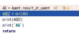 그리고 나서 이 결과를 한번 위 스크린샷처럼 Debug에서 나왔을 때, 제대로 나왔는 것을 볼 수 있기는 있었습니다. 일단 여기서는 매수라는 결과가 드디어 agent.py를 뛰어서 main.py로 옮겨온 것을 볼 수 있습니다.