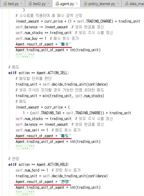 지난번 포스팅에서 무언가 잘못 되어서 py파일간, 클래스간 변수를 옮겨서 전달하는 것이 실패하기는 했습니다. 그래서 자료를 검색해 봐서, 한번 이번 포스팅에서 그 오류를 바로 잡고, 단순히 agent.py에서 매수/매도/관망 만이 아니라 얼마나 많은 수식을 거래할 지에 대해서 결정한 결과도 옮기도록 해 보고자 합니다.