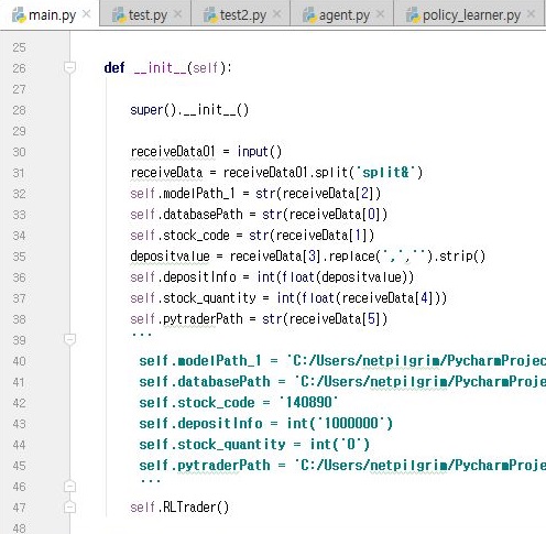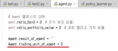 그리고 나서 main.py에 가서, 위 스크린샷처럼 Agent클래스의 거래할 주식의 량을 나타내는 변수를 한번 가지고 오도록 해 봅니다. 그리고 관련된 값이 print()함수로 표시가 되도록 합니다.