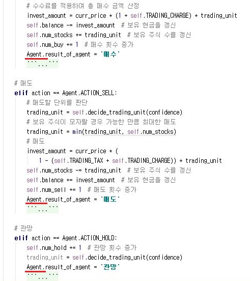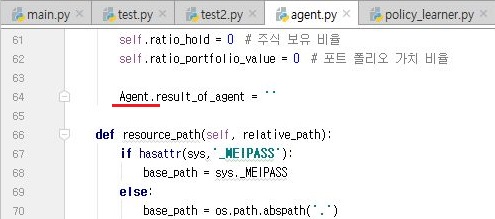 지난번 포스팅에서 무언가 잘못 되어서 py파일간, 클래스간 변수를 옮겨서 전달하는 것이 실패하기는 했습니다. 그래서 자료를 검색해 봐서, 한번 이번 포스팅에서 그 오류를 바로 잡고, 단순히 agent.py에서 매수/매도/관망 만이 아니라 얼마나 많은 수식을 거래할 지에 대해서 결정한 결과도 옮기도록 해 보고자 합니다.