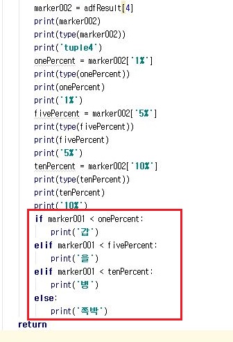 이제 지난번 포스팅에서 겨우겨우 어떻게 해서 ADF 테스트를 이용할 수 있게 되었습니다만, 그 결과는 튜플 형태로 모두 함축된 형태로 나오기 때문에, 이를 어떻게 그냥 한 두 종목이면 사람 눈으로 일일히 확인해 보겠지만, 문제는 1500개가 넘는 코스피 종목을 일일히 체크하기에는 피곤하다는 겁니다. 그래서 이 과정을 자동으로 만들기 위한 작업이 이어지게 됩니다.