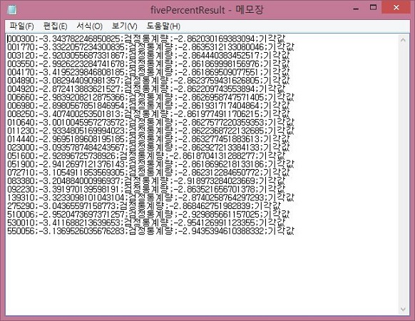 그래서 이번에는 본격적으로 코스피 전 종목을 스크린닝하기 위해서, 일단 검정 통계량부터 해당하는 값들을 각각의 퍼센트에 해당하는 txt파일에 집어 넣도록 해 줍니다.