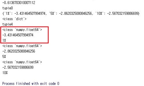 그리고 각각의 검정통계량이라고 해서 ADF 테스트가 시계열 데이터-여기서는 분봉에 따른 현재값을 보고서 계산하는데, 이를 바탕으로 각각의 랜덤워크라는 가설을 기각하기 위한 조건을 통과하면 해당하는 내용이 나오라고 만들어 놓았습니다.