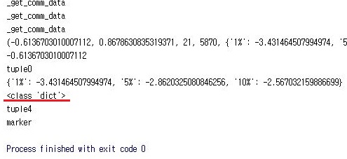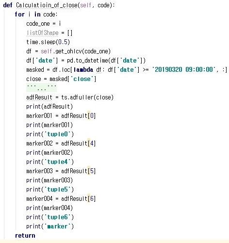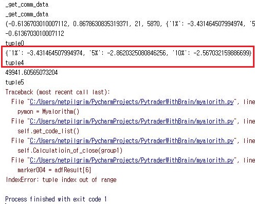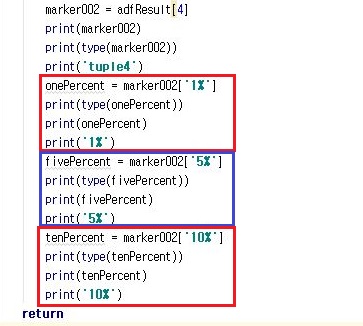 이제 지난번 포스팅에서 겨우겨우 어떻게 해서 ADF 테스트를 이용할 수 있게 되었습니다만, 그 결과는 튜플 형태로 모두 함축된 형태로 나오기 때문에, 이를 어떻게 그냥 한 두 종목이면 사람 눈으로 일일히 확인해 보겠지만, 문제는 1500개가 넘는 코스피 종목을 일일히 체크하기에는 피곤하다는 겁니다. 그래서 이 과정을 자동으로 만들기 위한 작업이 이어지게 됩니다.