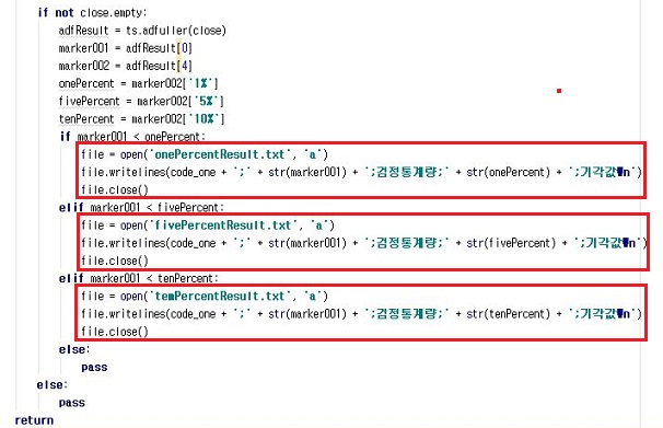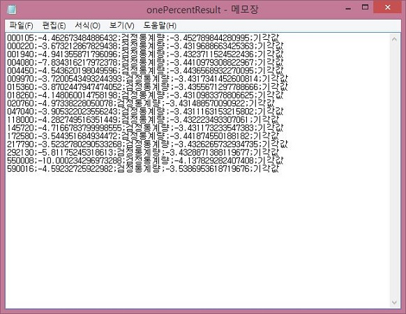 그래서 이번에는 본격적으로 코스피 전 종목을 스크린닝하기 위해서, 일단 검정 통계량부터 해당하는 값들을 각각의 퍼센트에 해당하는 txt파일에 집어 넣도록 해 줍니다.