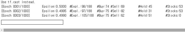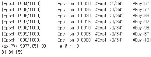 데이터의 양이 많아진 탓인지 몰라도, 3시간 넘게 걸리는 것을 확인할 수 있기는 있었습니다. 그런데 이번에도 강화학습 내내 단 한번도 수익을 내지 못했다는 것을 볼 수 있습니다.