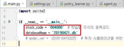 그래서 기존에 있던 yellow operation 프로젝트로 가서, 여기서 나와 있는 종목 코드랑 데이터 베이스의 이름을 바꾸어 주도록 해 봅니다.