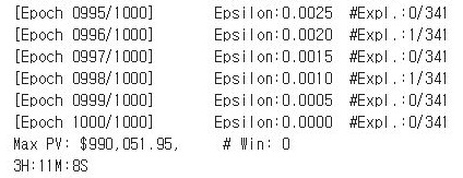 일단 이게 제대로 된 것인지 아닌지는 모르겠습니다만, 이렇게라도 강화학습에 들어간 다음에, 이 결과를 보고서 다음 포스팅에서 어떤 식으로 강화학습을 이어갈 것인지에 대해서 한번 언급을 하도록 해 보겠습니다. 그럼 계속해서 이상하게 보이기는 하는 결과를 뒤에 두고서 이번 포스팅은 여기서 마치겠습니다.
