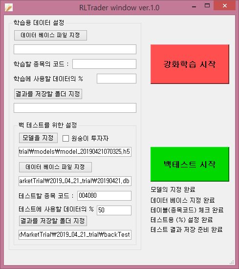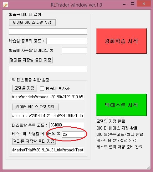 일단 지난번 포스팅에서 첫번재 강화학습은 전체 데이터의 50%만 사용했기 때문에, 이번에는 위 스크린샷처럼 수익모델과 데이터 베이스등을 지정하고 나서, 다음으로는 50%의 데이터를 백테스트에 사용해 보도록 합니다.