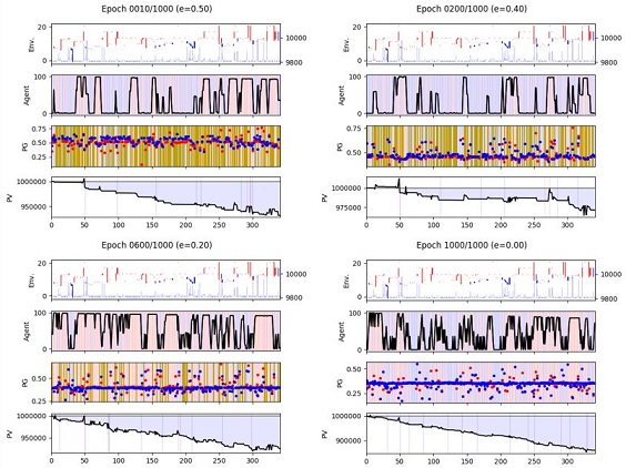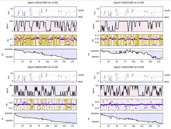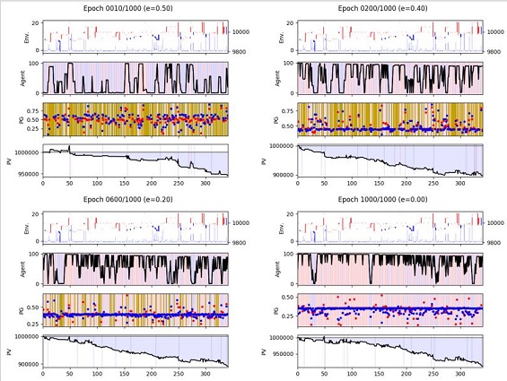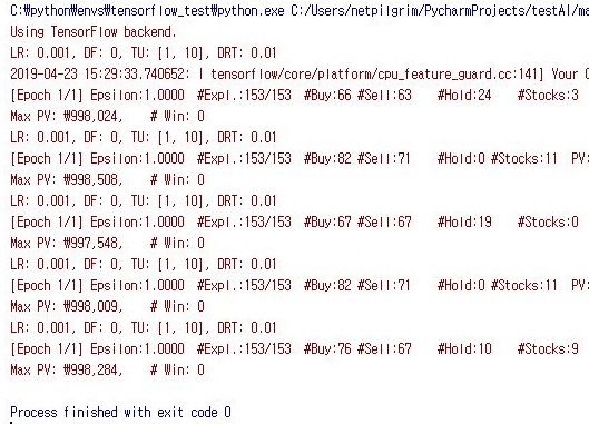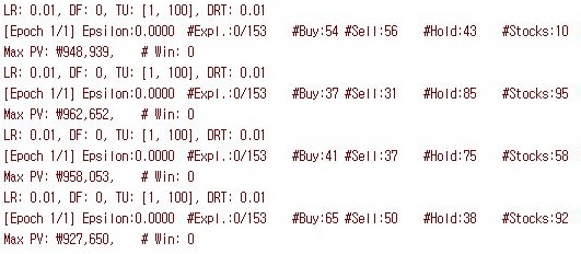 그러나 결과는 참담하다면 참담하게도 4시간 반 가까이 걸린 강화학습 끝에 단 한번도 수익을 내지 못한 결과만이 나오는 것을 확인할 수 있었습니다. 이래서야 시간도 시간대로 안 나오고, 수익도 수익대로 안 나오는 상황만을 확인할 수 있었습니다.