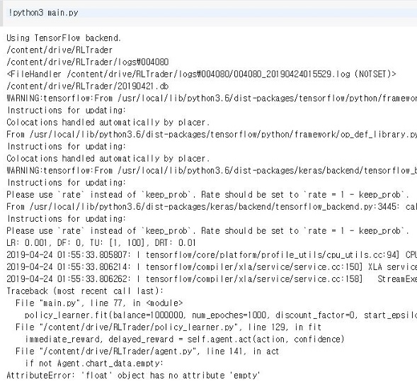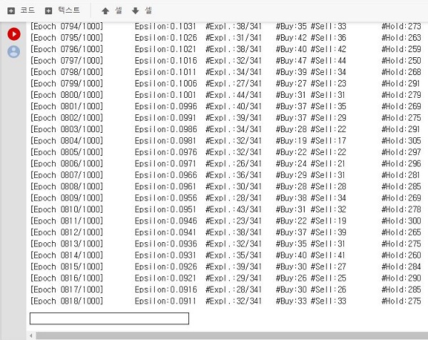 그런데 어째서 인지 제대로 수익도 안 나오고, 도중에 구글 드라이브와의 연결도 끊어져서 그대로 뭐가 제대로 되지 않는 것을 볼 수 있었습니다. 한마디로 총체적인 난국인 상황이 되었습니다만, 일단 이건 이거고, 계속해서 주식이 강화학습 기간 내내 수익을 내지 못하는 모습을 보여주고 있습니다.