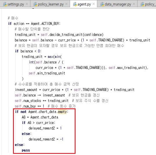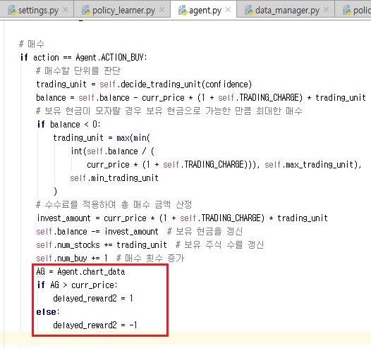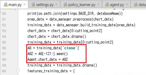 다음으로는 위 스크린샷에서 보이는 것처럼 일단 평균적인 현재가-close를 구한 다음에, 이를 한번 agent.py에 적용시켜 보도록 합니다.