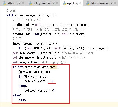 그리고 매도를 했을 경우에는 평균적인 현재가의 값보다 더 크게 팔았을 경우에 정말 큰 득점을 주도록 설계를 해 보도록 합니다.