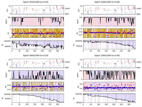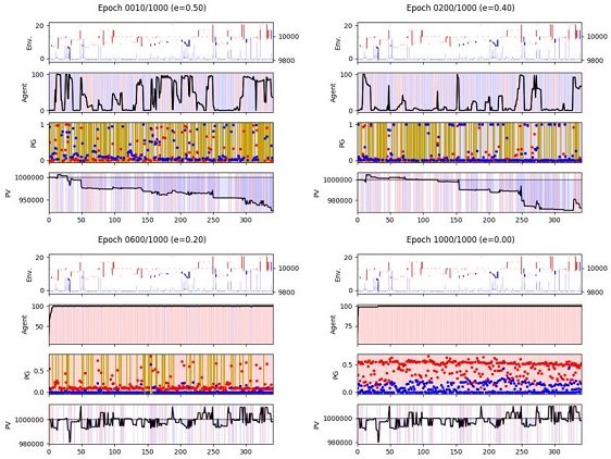 일단 10, 200, 600, 1000에포크 일때를 한번 비교해 보고 있습니다만, 어찌된 것인지 모르겠습니다만, 조금도 초반부터 수익이 전혀 나오지 않는 것을 볼 수 있습니다.
