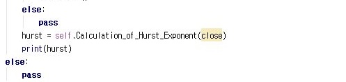 그리고 나서 위 스크린샷처럼 한번 허스트 지수를 계산해 주는 메서드를 한번 [머신러닝을 이용한 알고리즘 트레이딩 시스템 개발]이라는 책에 나와 있는 그대로 가지고 오도록 합니다.