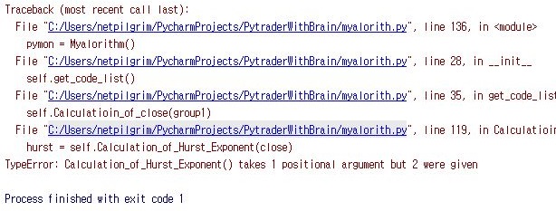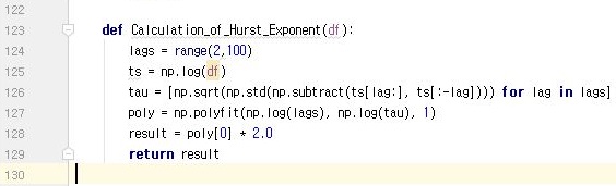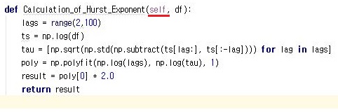 그리고 나서 위 스크린샷처럼 한번 허스트 지수를 계산해 주는 메서드를 한번 [머신러닝을 이용한 알고리즘 트레이딩 시스템 개발]이라는 책에 나와 있는 그대로 가지고 오도록 합니다.