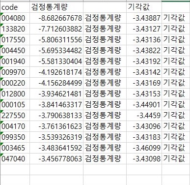 일단 위 스크린샷처럼 일련의 결과들이 각각 adf 테스트, 허스트 지수, half-life등이 나오는 것을 확인할 수 있기는 있었습니다.