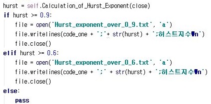 먼저 위 스크린샷과 같이 허스트 지수가 0.9 이상이면 해당하는 txt파일에 적어 주도록 하고, 아니면 0.6이상일 시에 또 해당하는 txt파일에 들어가도록 합니다. 그도 아니면 그냥 통과합니다.