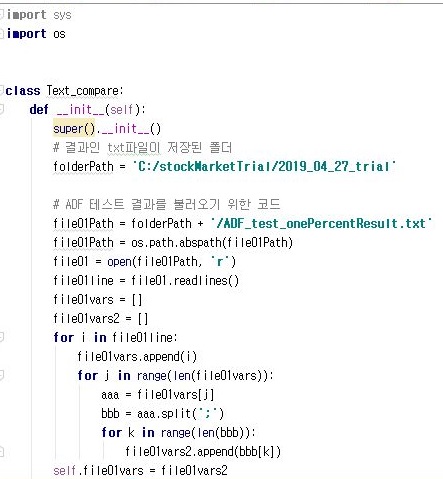 먼저 위 스크린샷에서 볼 수 있듯이, 새로운 py파일을 생성한 다음에, Text_compare라는 클래스를 생성해 주도록 합니다. 그리고 나서 모든 txt파일로 저장된 결과가 한개의 폴더에 저장이 되어 있기 때문에 폴더의 경로를 지정해 준 다음에, 다음으로 ADF 테스트의 결과를 열도록 해 줍니다.