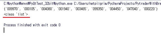 이렇게 해서 위 스크린샷처럼 원하는 요소들-특히 주가의 종목코드만을 추려내는 데는 성공한 것을 볼 수 있는데, 문제는 데이터의 타입이 set이라고 해서 호출이라고 해야 할까요? 말 그대로 부르기(call)을 할 수 없는 형식이기 때문에, 이를 리스트의 형식으로 바꾸어 줄 필요가 있습니다.
