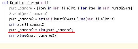 그래서 이번에는 위 스크린샷과 같이, var = set(리스트A) and set(리스트B) 라는 공식을 이용하도록 합니다. 이 공식이 찾아보니까, 리스트 두개에서 일치하는 요소를 골라낼 수 있다고 합니다.