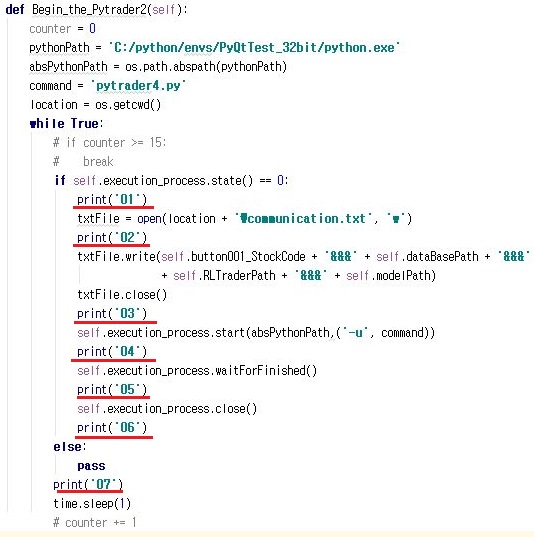 그리고 나서 pytrader4를 실행시키도록 하는데, 당연하다면 당연하게도 상위의 부모 프로세스에서 실행을 시켜 주도록 합니다.