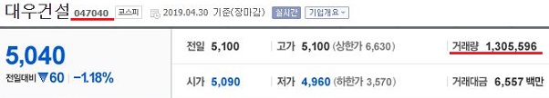 그리고 나서 대우건설의 거래량을 보았더니, 백만이 넘는 거래량을 자상하는 대형주라는 것을 확인할 수 있다는 생각이 들었습니다.