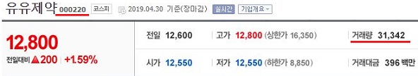 다음은 유유제약이라는 제약회사의 거래량을 한번 보았습니다. 여기는 거래량이 3만이 넘어가는 것을 확인할 수 있었습니다. 그리고 이 이상으로 거래량이 많은 기업이 있을 것이라고 해봐야 겠다.