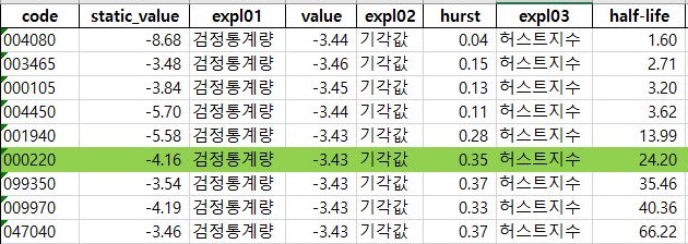 일단 first클래스에 있는 내용을 바탕으로 해서, 거래량이 많으면서도 ADF 테스트를 통과하고 허스트 지수가 상당히 낮으면서 동시에 평균으로 돌아오는 시간이 아니라는 점에서 종목코드 000220인 유유제약을 선정하였습니다.