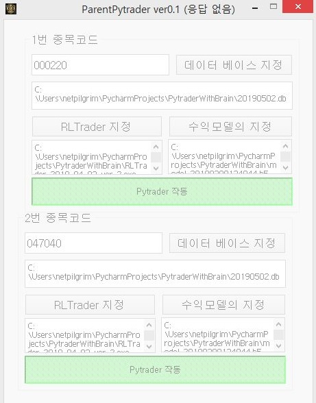 거기다가 가끔씩 위 스크린샷처럼 ParentPytrader가 얼어버려서 아무런 응답도 없는 상황이 발생해 버리는데, 이것 역시 2개의 프로세스를 작동시키다 보니 더 자주 발생하는 듯 합니다.