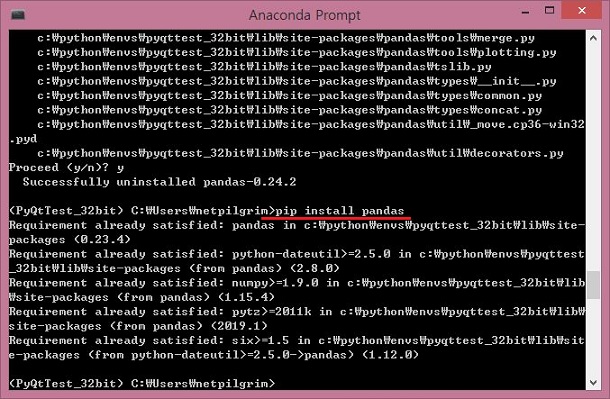 다음으로는 위 스크린샷에서 보이는 것처럼 한번 pandas의 unistall역시 한번 만들어 주도록 합니다. 모든 언인스톨 명령은 pip uninstall 모듈이름 이라는 형식으로 가능했습니다.