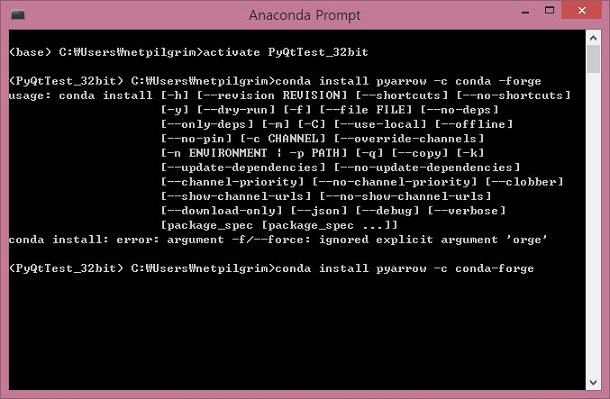 그런데 오타를 내서 한번 conda install pyarrow -c conda-forge라는 명령어를 정확하게 입력했어야 했는데 그렇지 못해서 다시 입력합니다.